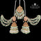 Traditional polki earrings and tika combo set in 22 k gold platting embelished with star cut zirconium stones and brass base. Handcrafted by our experienced artisans in Polki kundan. Emerald real hangings can be customised in any color on order